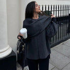 • Corte relajado y fluido: El patrón oversize facilita superponerlo sobre prendas de punto, vestidos o conjuntos más estructurados.