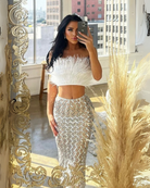 Haz una impresión audaz con el Conjunto de Plumas de Cristal Ione — una fusión decadente de ricas texturas y detalles brillantes. Este conjunto de dos piezas logra el equilibrio perfecto entre drama y refinamiento, combinando un top suave y emplumado con una falda cubierta de lentejuelas que irradia desde todos los ángulos. Ideal para noches de celebración, eventos en azoteas, o cuando simplemente quieres destacar sin decir una palabra.