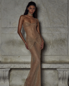 Jonquil es una obra maestra de elegancia atrevida, diseñada para apoderarse del momento con una presencia magnética. Su silueta sin tirantes y el cuello estructurado crean un contraste refinado, mientras la capa transparente fluye como luz líquida sobre la piel. Ideal para noches sofisticadas, galas o cualquier ocasión donde el drama y la elegancia se fusionen.